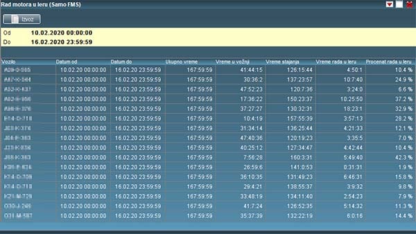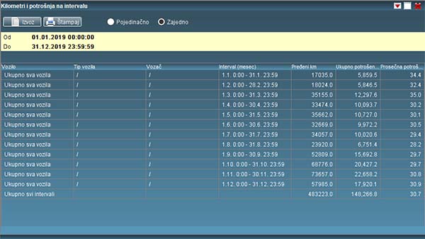 Korišćenjem ovog rešenja korisniku se pruža mogućnost da poveća efikasnost rada svog voznog parka obezbeđujući mu sveobuhvatan uvid u pređene kilometre, potrošeno gorivo i korišćenje voznog parka u posmatranom periodu.